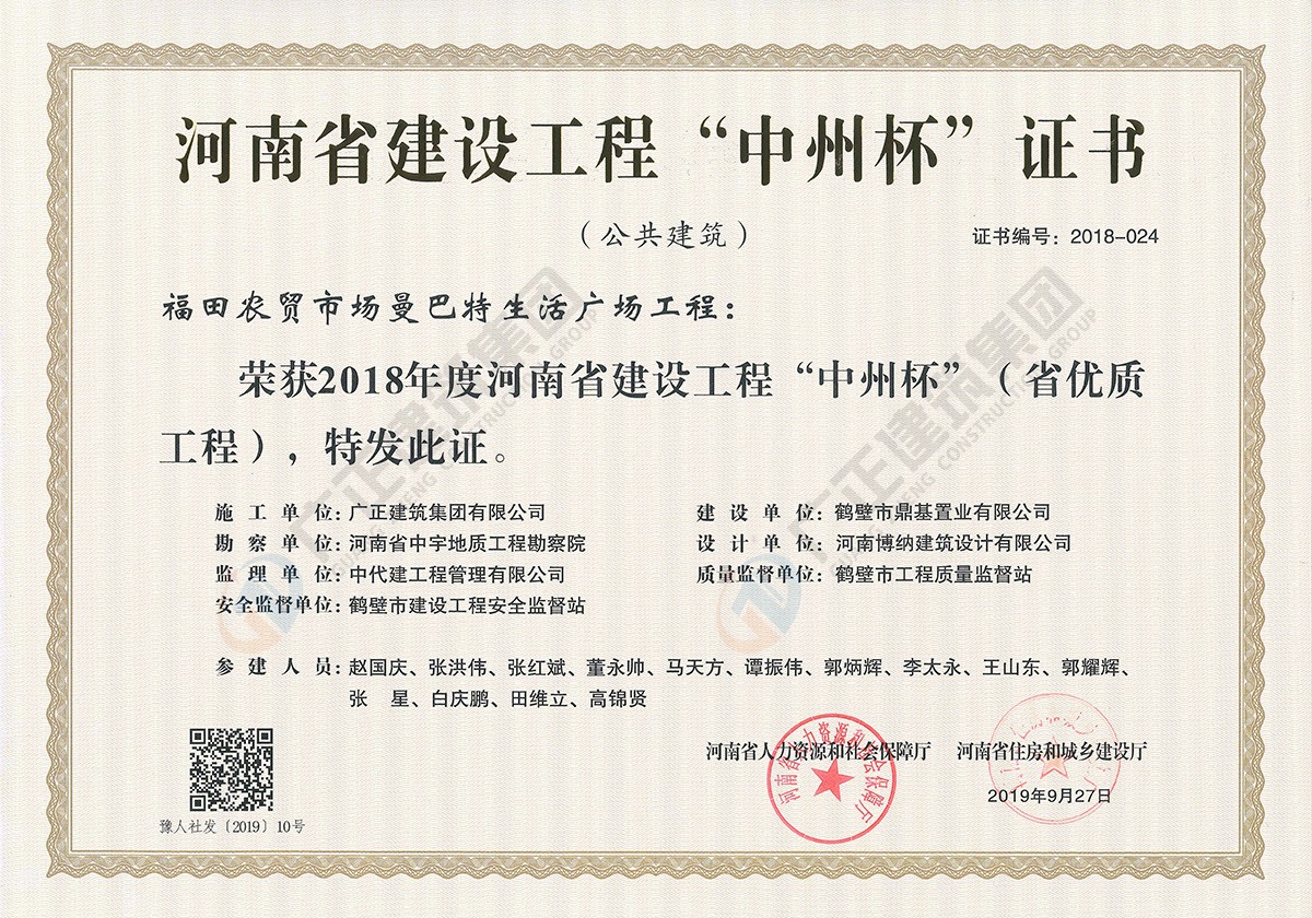 福田农贸市场曼巴特生活广场工程荣获2018年度河南省优质工程“中州杯”