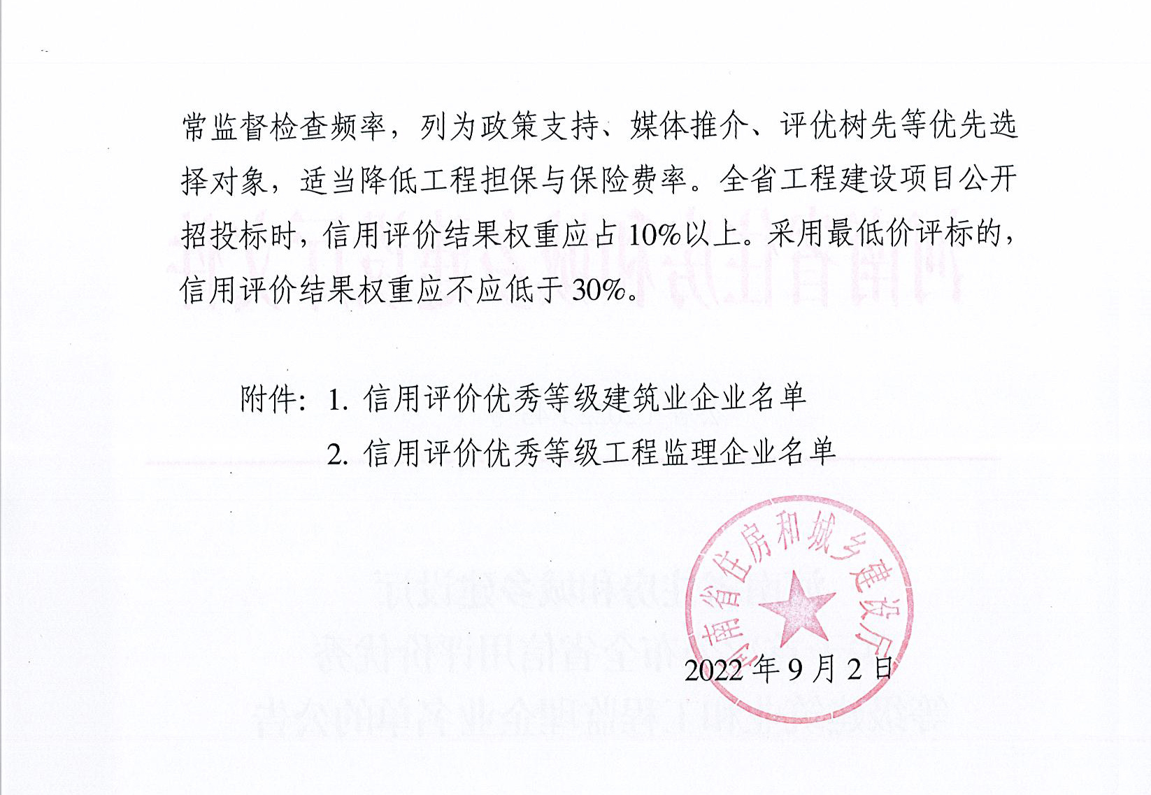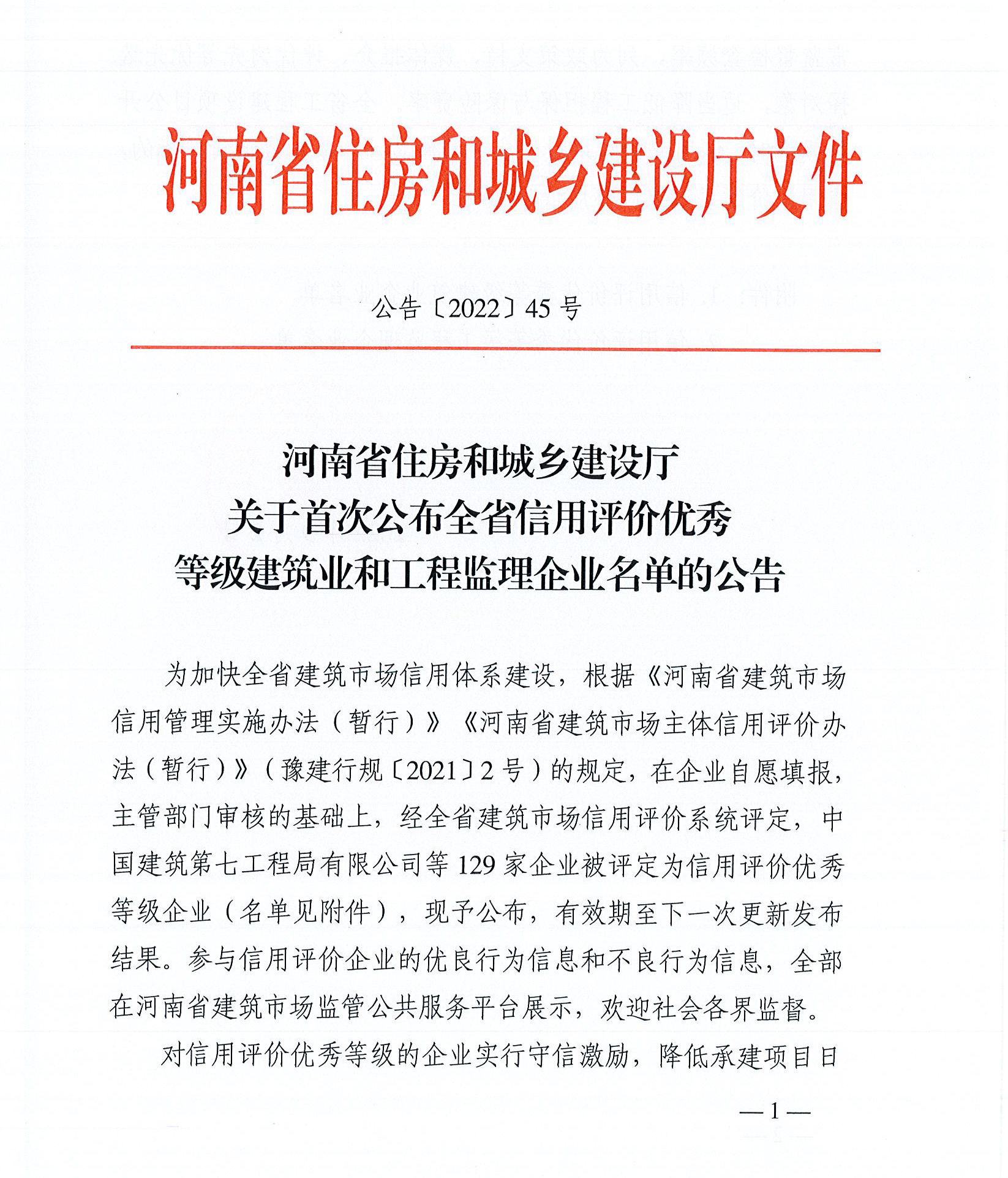 近日,经全省建筑市场信用评价系统评定,我公司被评定为河南省信用评价优秀建筑企业!